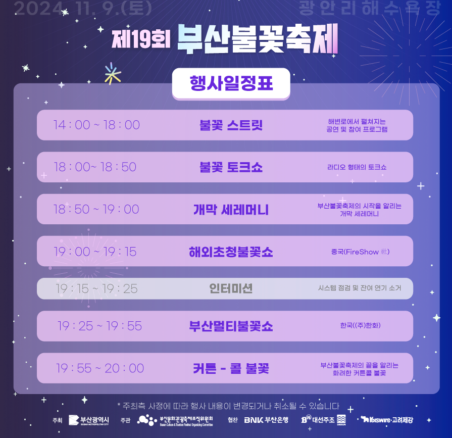 2024년 부산 불꽃축제는 11월 9일 (토요일) 저녁 6시 50분 개막 세레머니 부터 시작하여, 부산 광안리 해변에서 다채로운 불꽃과 함께 열립니다. 축제는 낮부터 각종 부대 행사가 진행되며, 본격적인 불꽃쇼는 저녁 7시 해외초청불꽃쇼와 부산멀티불꽃쇼가 이어지며, 마지막 대형 불꽃으로 화려한 마무리를 장식합니다